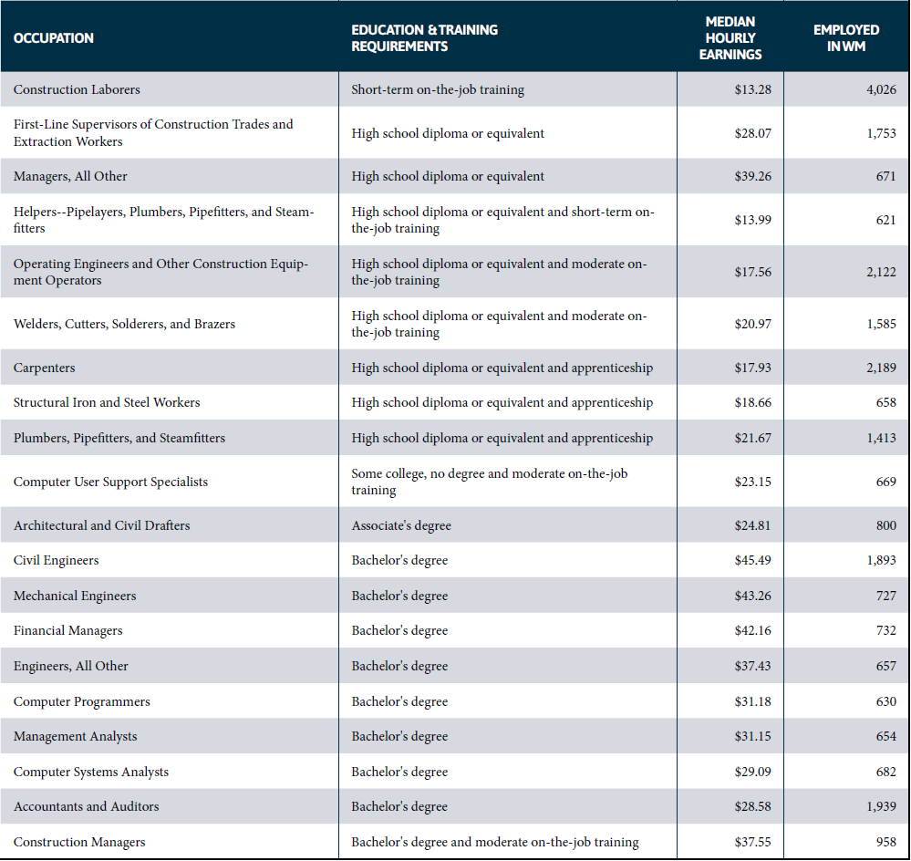 Of the top 20 occupations in WM, the greatest overlap is with two specific industry clusters: local real estate, construction, and development, as well as oil and gas production and transportation.