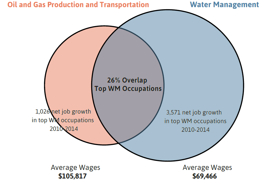 Water management has a distinct wage disadvantage as compared to oil and gas where average annual wages are $105,817. However, jobs in the WM cluster grew at a faster rate from 2010 to 2014.