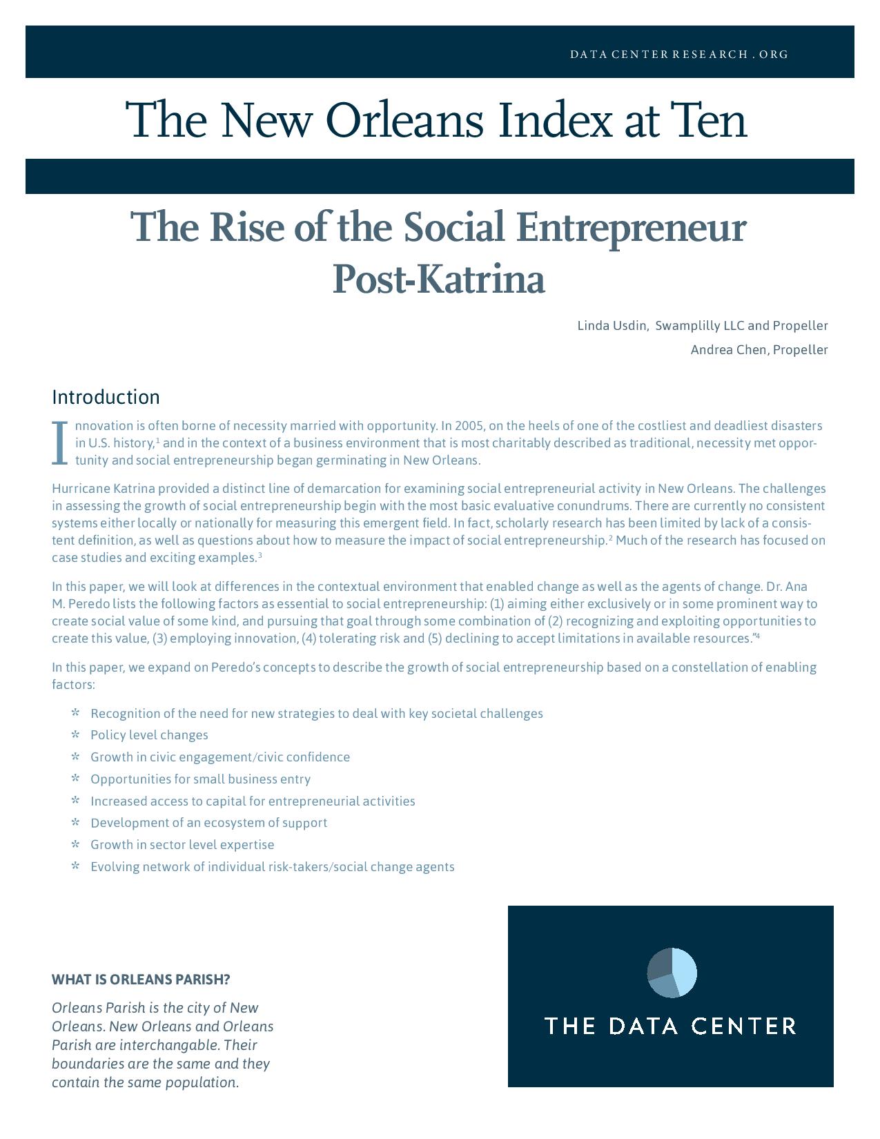 Post Hurricane Katrina, during a series of events that sought to quickly reform failing schools and ensure every child that needed school placement had one, all NOLA PS schools were converted to charter. As the transition was taking place, OPSB’s role transformed and the community's relationship to local schools changed dramatically. This paper assesses the pros and cons of this transition to a mostly charter system and describes how the school environment has changed since Hurricane Katrina.
