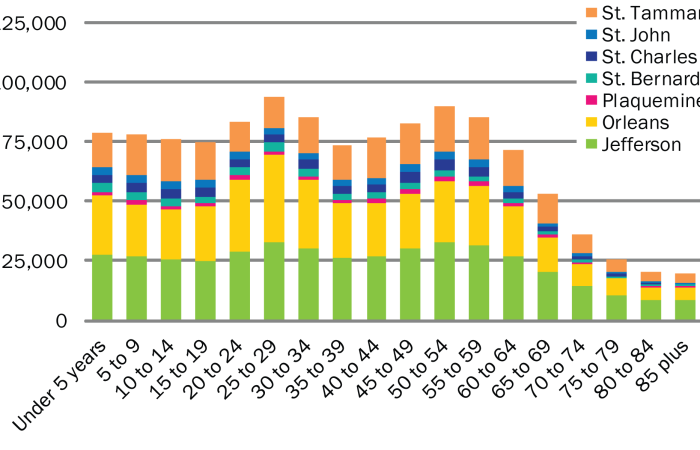 This interactive explores 2012 demographic data from the U.S. Census Bureau in parishes across the metro area. Be sure to read the report and download the data tables for analyses of important trends.